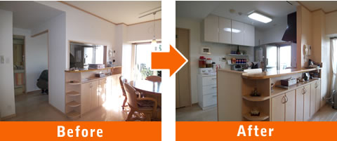 全体を明るくされたい。というご要望で、キッチン、リビングダイニングのクロスを貼り替え、キッチンの吊戸棚は後ろ側へ移設。リビングとのコミュニケーションがとれる明るいキッチンにリフォーム。