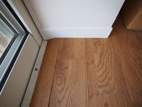 今回生じた、掃きだしサッシとの段差には、ナラの無垢材を見切り材として加工したものをフローリングと同じ塗装工場へ持ち込み同色に塗装。