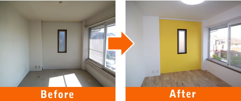 正面の鮮やかなイエローの壁面は、クロスではなく塗装で仕上げました。