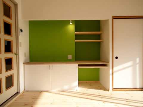 中途半端に設置された使い勝手の悪い物置を撤去し、パソコンデスクと可動棚を造作。
