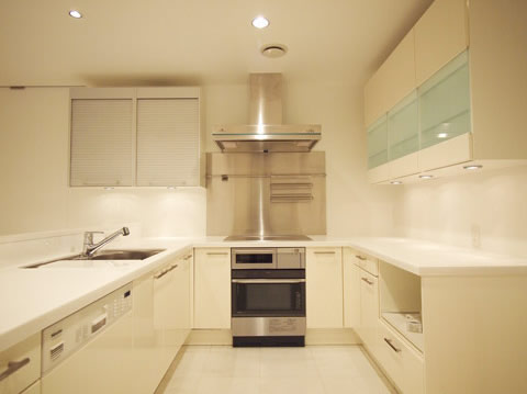 キッチンカウンター下の収納を取り払いスッキリとした印象に。