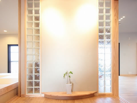 玄関ドアを開けると、ガラスブロックから光が差込む明るい玄関。