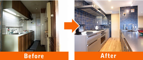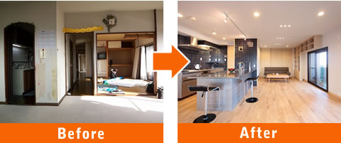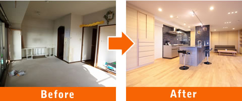 独立していたキッチン空間の壁をなくし、和室、廊下部分もLDKに取り込み、広々とした家族が集える明るい空間に。