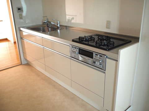 収納扉が艶のある素材でキッチンパネル、クロスに白を選び、以前よりも明るい空間になりました。