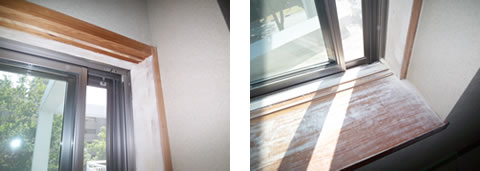和室の木製窓枠としらきのカウンターに傷が入り傷んでいたので、和風の木目調シート貼りをしました。