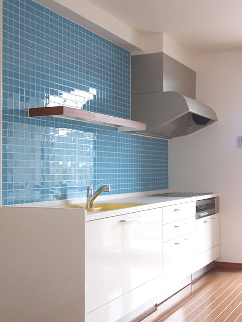 キッチンに貼ったのは、タイルではなく透明感ある美しいモザイクガラス。