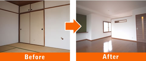 2間あった和室を解体し、ひとつの空間に間取り変更。