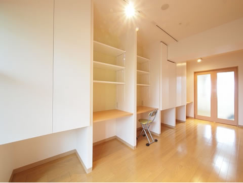 勉強机、PC机一体の壁面造作家具でスッキリした空間に。