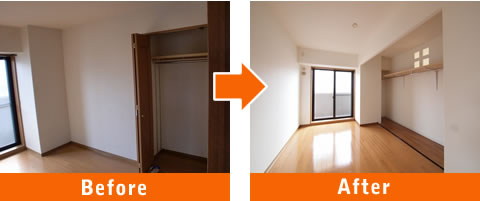 リビングとの間仕切り壁をクローゼットごと解体し、リビング側の収納スペースを洋室に取り込みクローゼットを拡張。