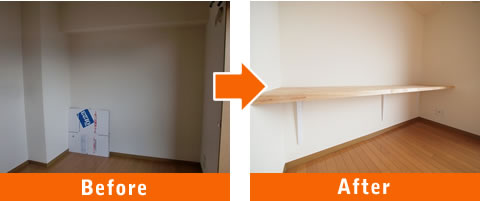 梁などで出来た凹凸のあるスペースにカウンターを一枚取付けデスク兼作業コーナーに。