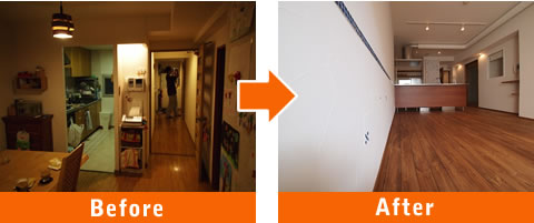 全体的に暗く狭い印象を受けるダイニング空間から天井を高くし解放感ある明るいDK空間に。