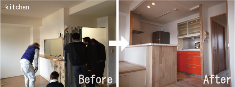 キッチン本体はキレイな既存のものをそのまま利用。工事中は取り外し、工事後もとに戻すといった流れです。