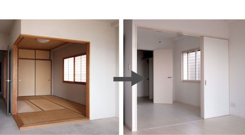 和室を1.5畳分LD内に残し残りの4.5畳を洋室に変更。LDとの区切りに3枚戸襖を新設、障子は和風感を消すために白のウレタン塗料で着色した。片開き扉の奥はウォークインクローゼット